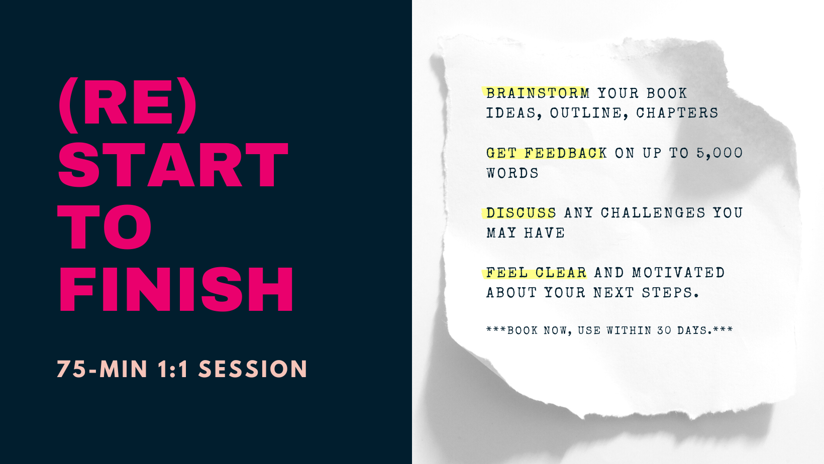 Book a (Re)Start to Finish Your Book intensive and together we’ll get you closer to the finish line!